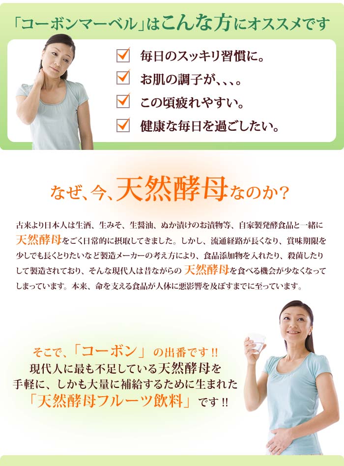 日本人の体に適した「天然酵母」を手軽にとれるコーボンマーベルで元気な毎日をお過ごしください。