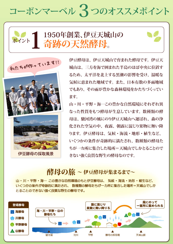 その原点は、日本に古くから伝わる味噌・しょうゆ・酒などの発酵食品。この発酵食品をつくる神秘的な微生物であり、現代人に不足している「天然酵母」を補給するためにコーボンマーベルは、誕生しました。