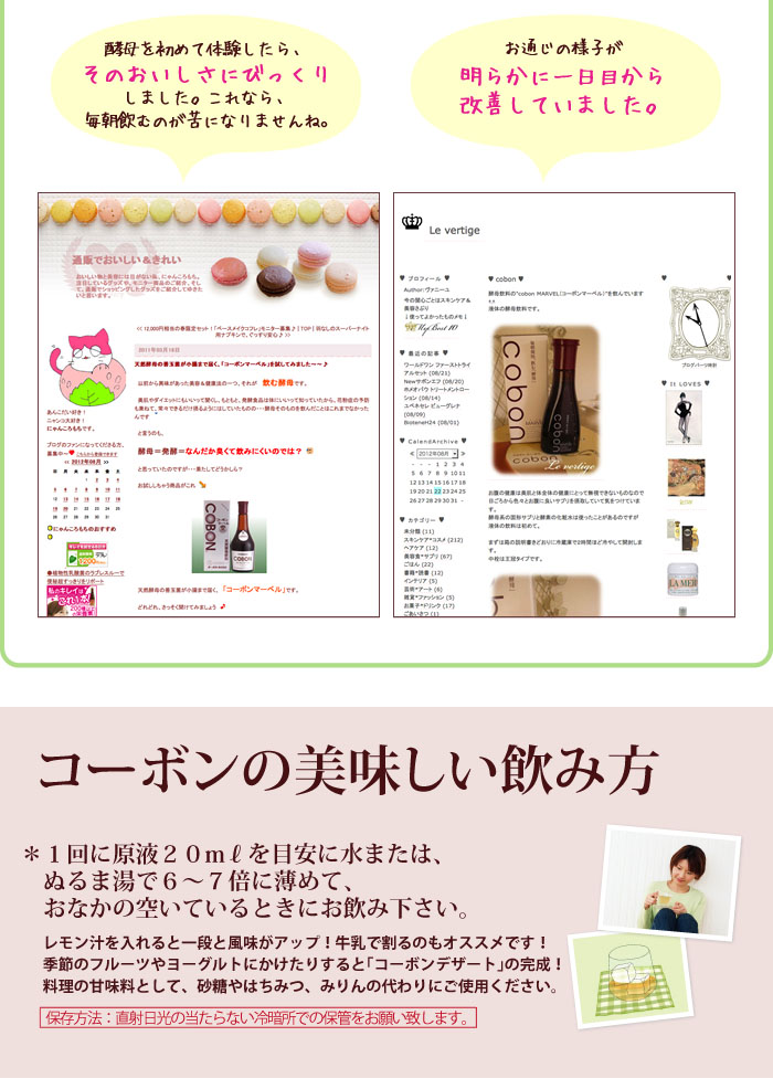 コーボンマーベルは、 20mlの原液を、水またはお湯で6~7倍にうすめ、 1日1回から3回を目安にご愛飲下さい。