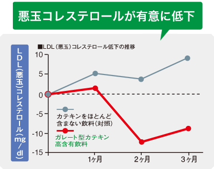 また、コレステロールの吸収を抑制する茶カテキンの働きにより血清コレステロール、特にLDL(悪玉)コレステロールを低下させるのが特長です。コレステロールが高めの方の食生活の改善に役立ちます。