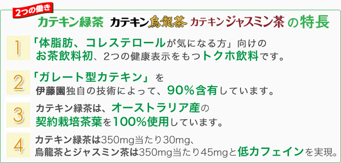 お茶飲料特保初!体脂肪とコレステロールの2つを抑える働き! 食生活改善のお手伝い、1日350ml2本であなたも健康体に。 苦味成分であるカフェインを抑え、食事に合うおいしさを実現。